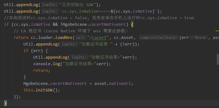 我发现测试时cc.sys.isNative = false,所以if里面的没有进去,发布到安卓后就进去了,然后加载证书好像有问题,就直接return了,我不太懂加载证书是什么意思,