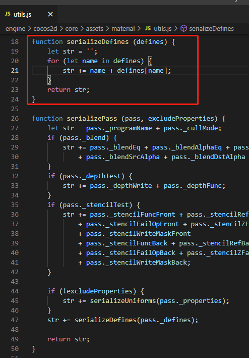 如下图所示 serializeDefines方法 序列化 Defines 不考虑顺序会使完全相同的材质defines 序列化出不同的字符串 使检查合批失败