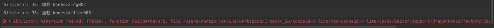 Assertion failed: (false), function buildArmature, file /Users/nantas/jenkins/workspace/Creator_2D/cocos2d-x-lite/mac/cocos2d-x-lite/cocos/editor-support/dragonbones/factory/BaseFactory.cpp, line 456.