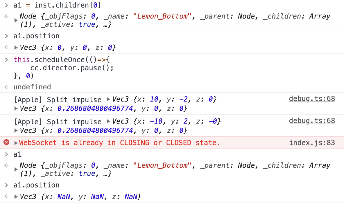 调试如图,该物体(多个碰撞箱)被创建后,scheduleonce到下一帧之后position就变成NaN,多个同类物体使用同一逻辑,而只有部分物体才会发生这一现象