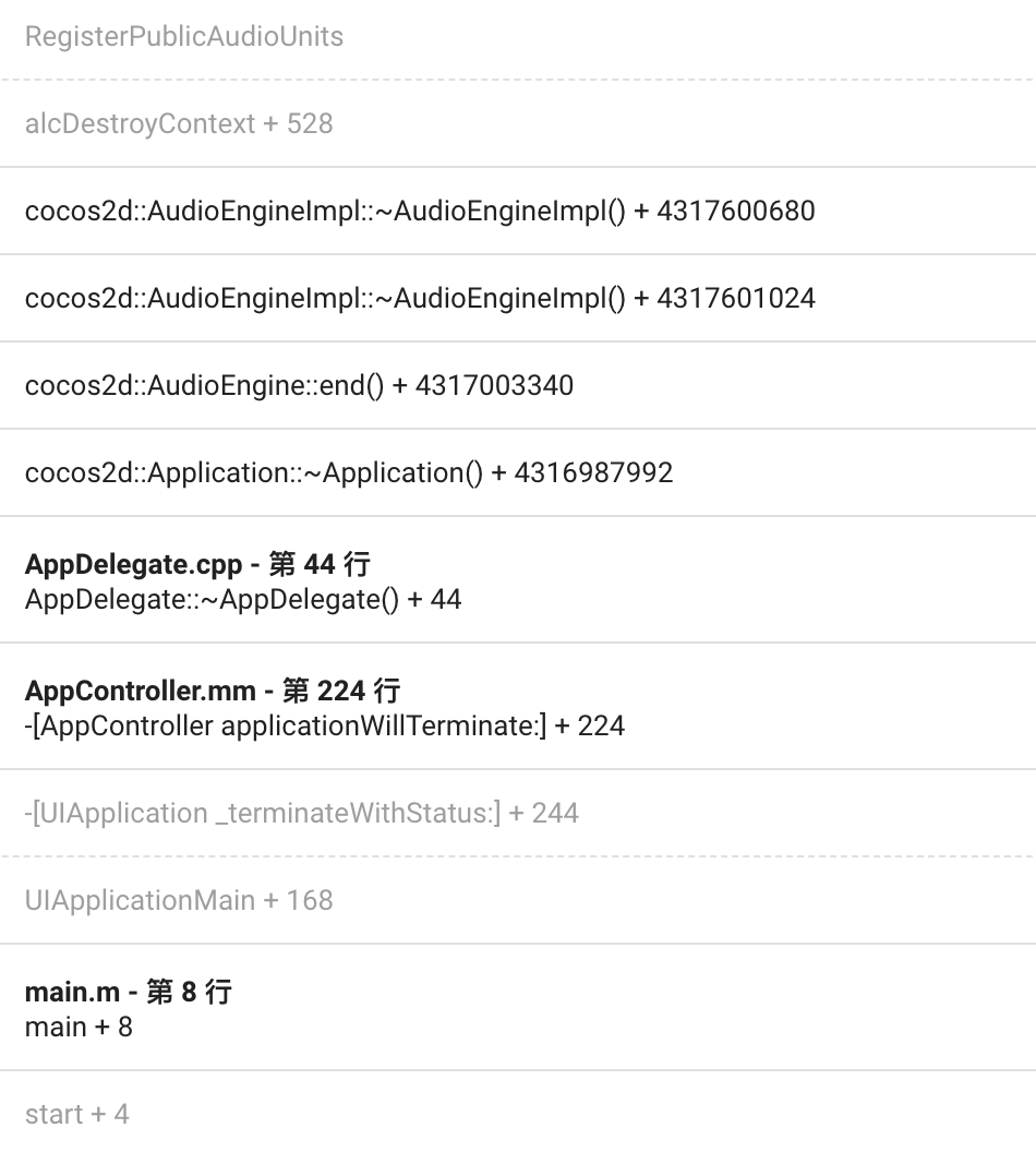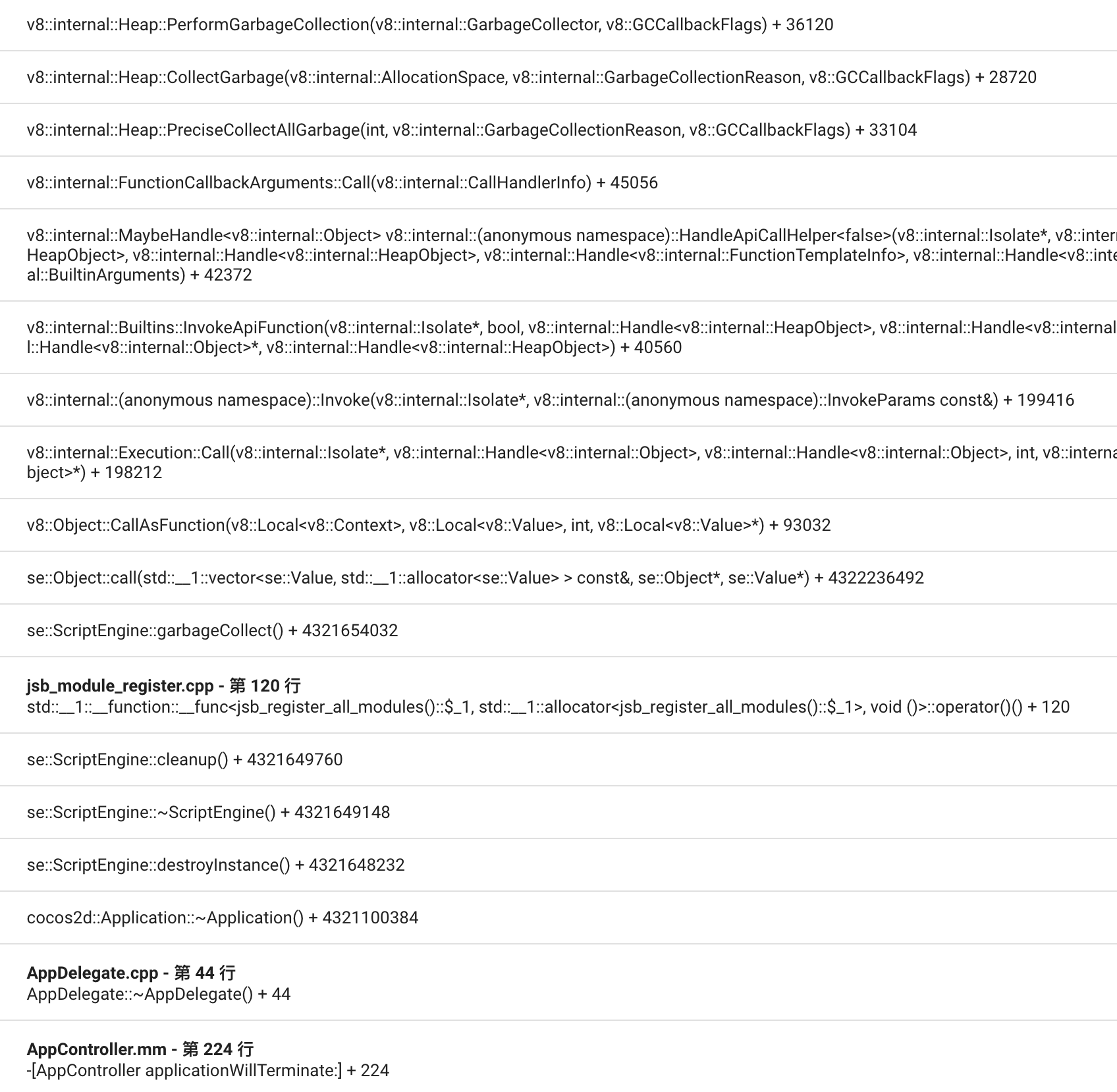 遇到类似的情况,2.4.4版本,接firebase,能看到iOS在关闭游戏的时候崩溃堆栈非常多,大多都是audio、v8的底层崩溃。