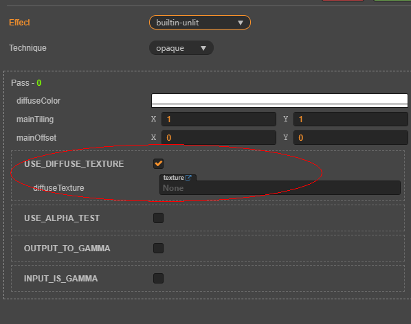感谢,可以了,我在面板上创建的材质看到这个USE_DIFFUSE_TEXTURE,是要勾选才能设置,就是不知道代码里面怎么设置,原来是这么设置的,感谢感谢