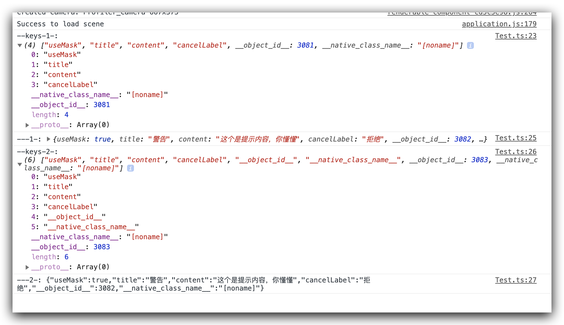 Test.ts:26 --keys-2-: (6) [“useMask”, “title”, “content”, “cancelLabel”, “object_id”, “native_class_name”, object_id: 3083, native_class_name: “[noname]”]0: "useMask"1: "title"2: "content"3: "cancelLabel"4: "object_id"5: "native_class_name"native_class_name: “[noname]“object_id: 3083length: 6__proto__: Array(0)