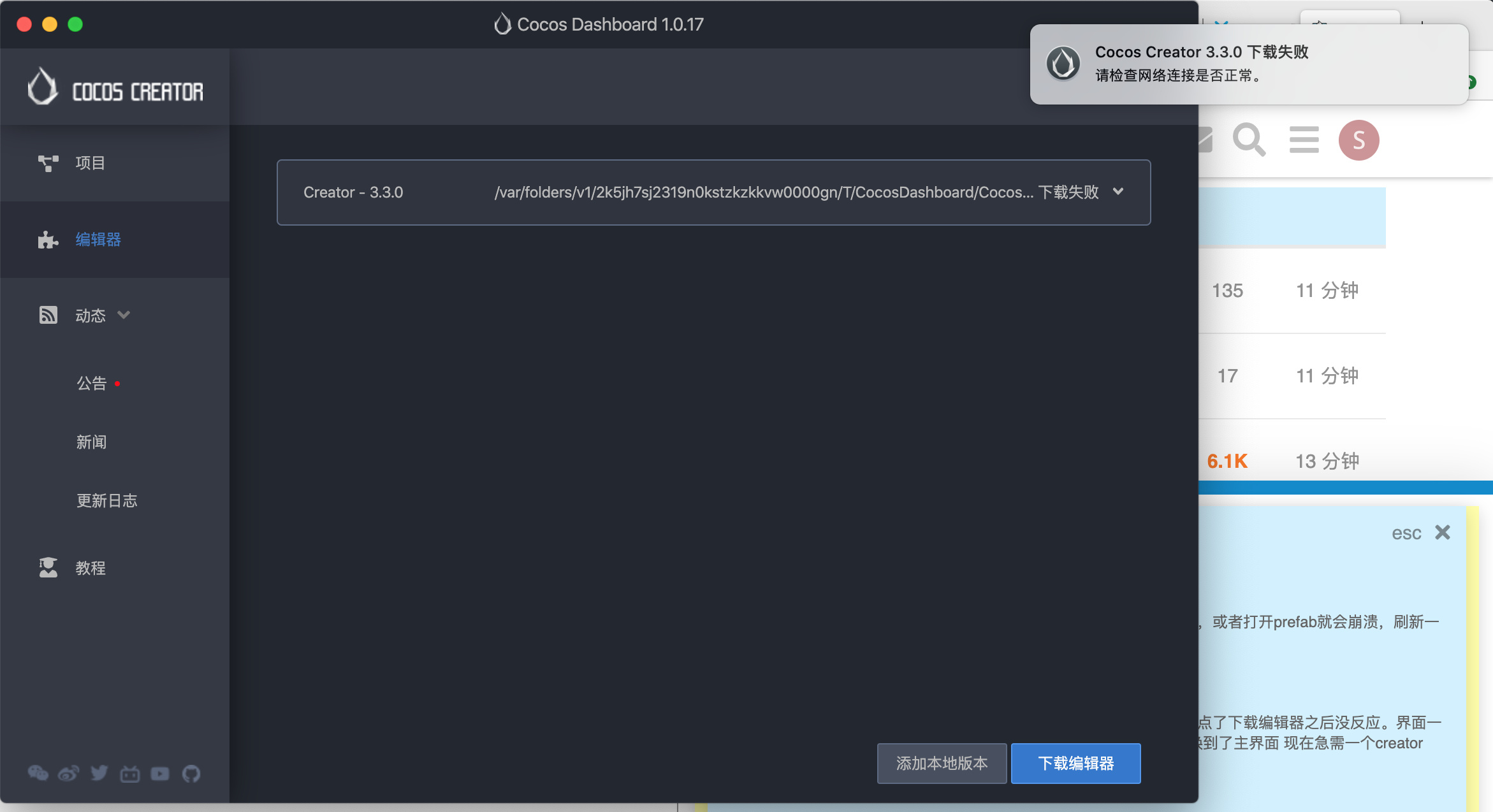 从官网新下载的dashboard,然后进入编辑器tab,点击下载creator - 3.3.0,下载完成之后立即报错,下载失败。