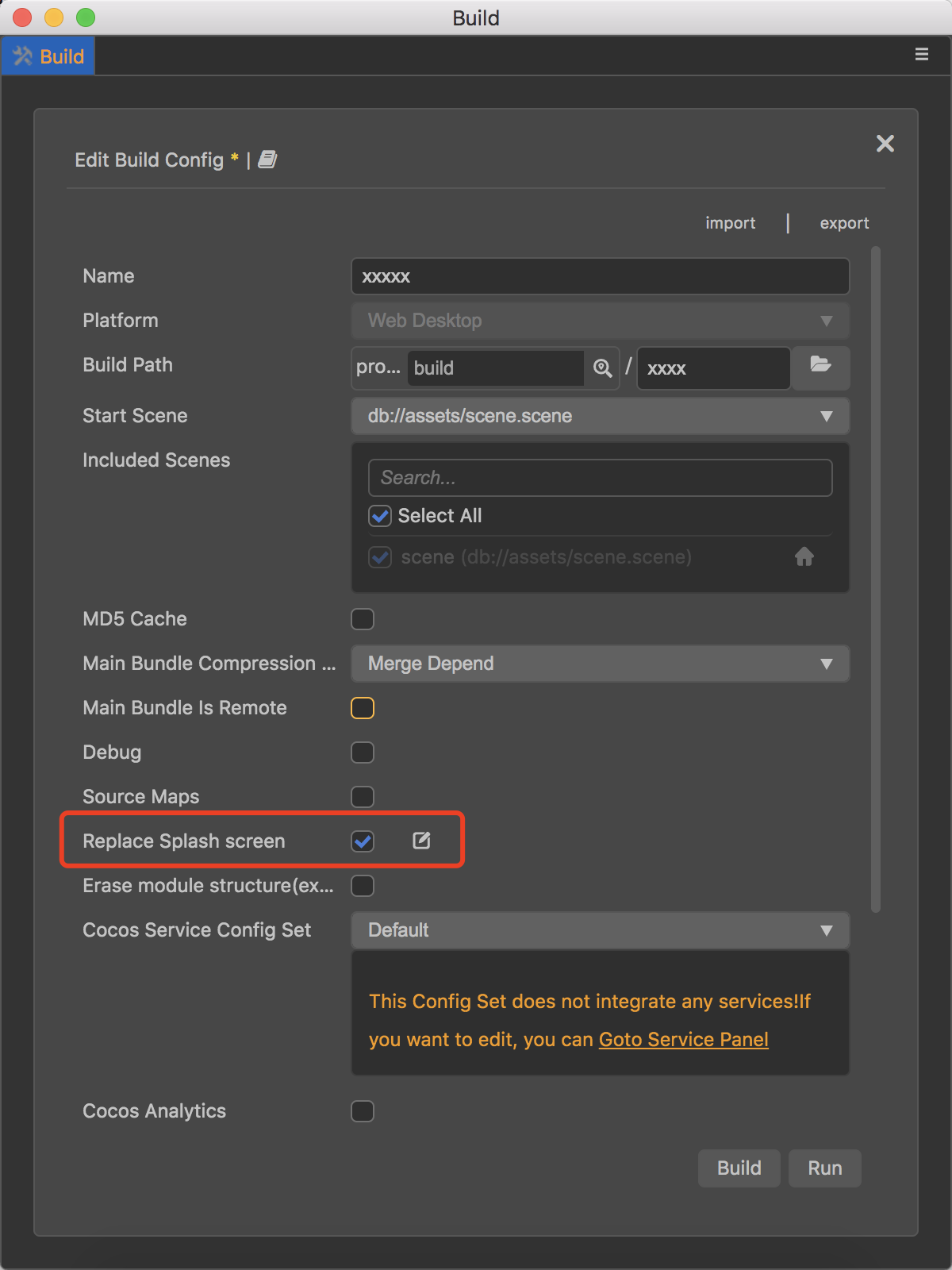 构建面板中有个Replace Splash screen选项,打钩修改即可: