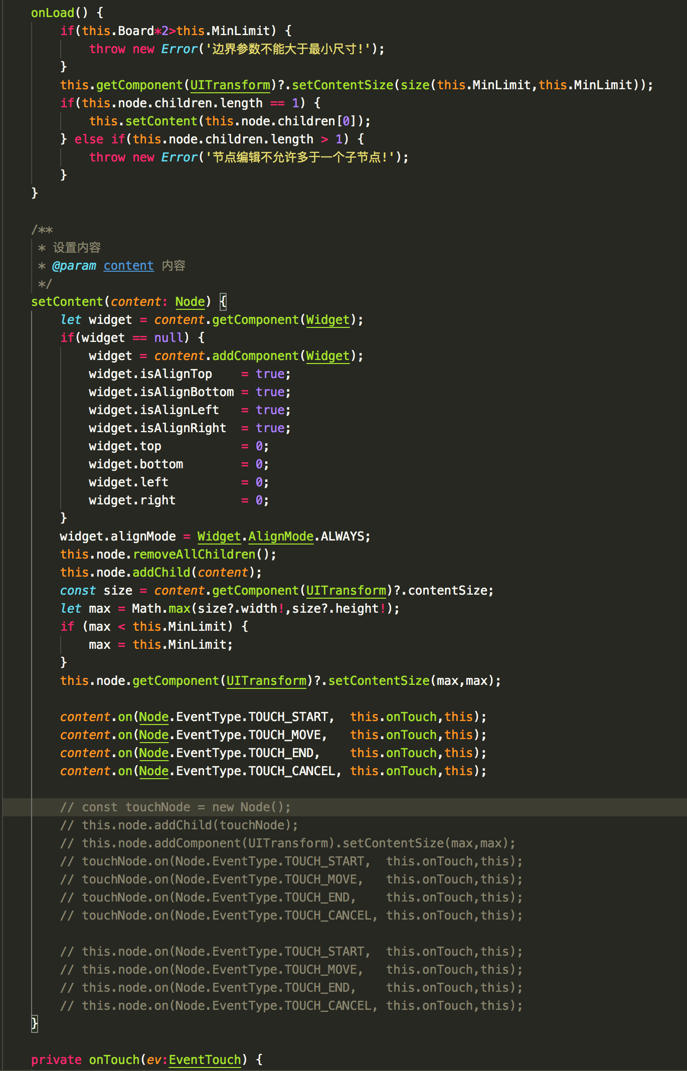 触摸添加到节点的内容里可以监听到,但是用注释的那段代码动态创建一个或者添加到自己身上就不行了?想知道什么原因…