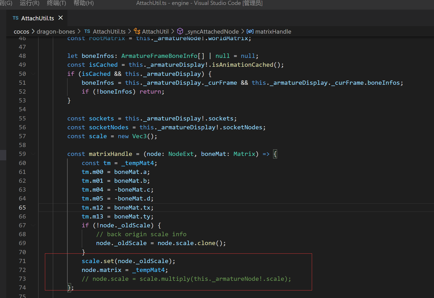 修改引擎源码,注释这个。这个文件位置在 engine/cocos/dragon-bones/AttachUtils.ts文件的matrixHandle接口。Line 73。
