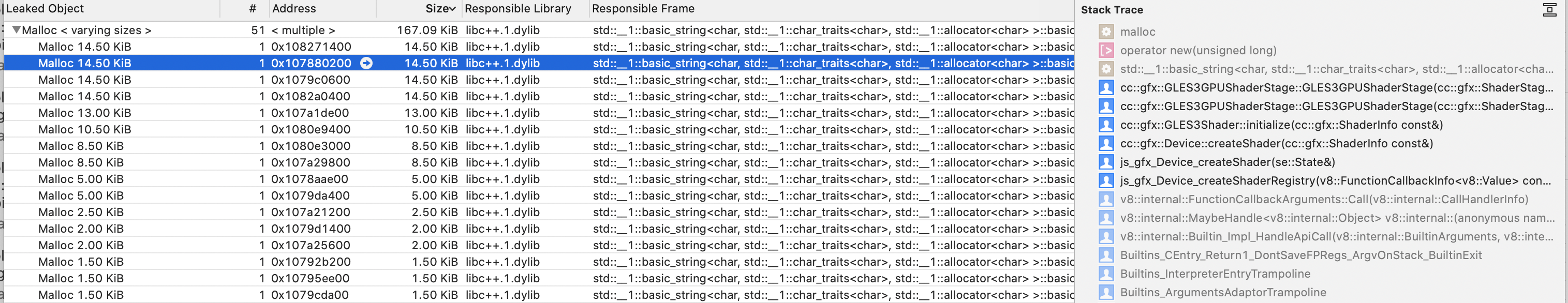排在前两位的泄漏是GLES3Shader和GLES3CommandBuffer: