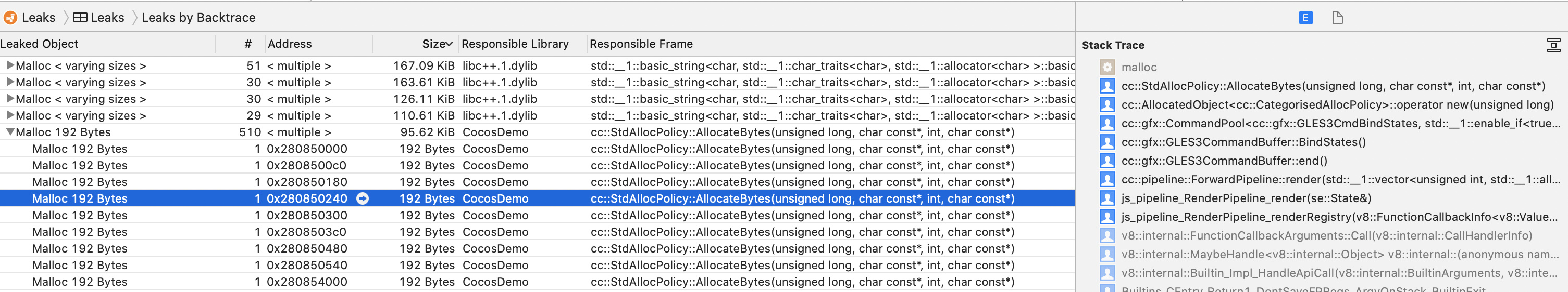 下面是leaks工具检测出的内存泄漏: