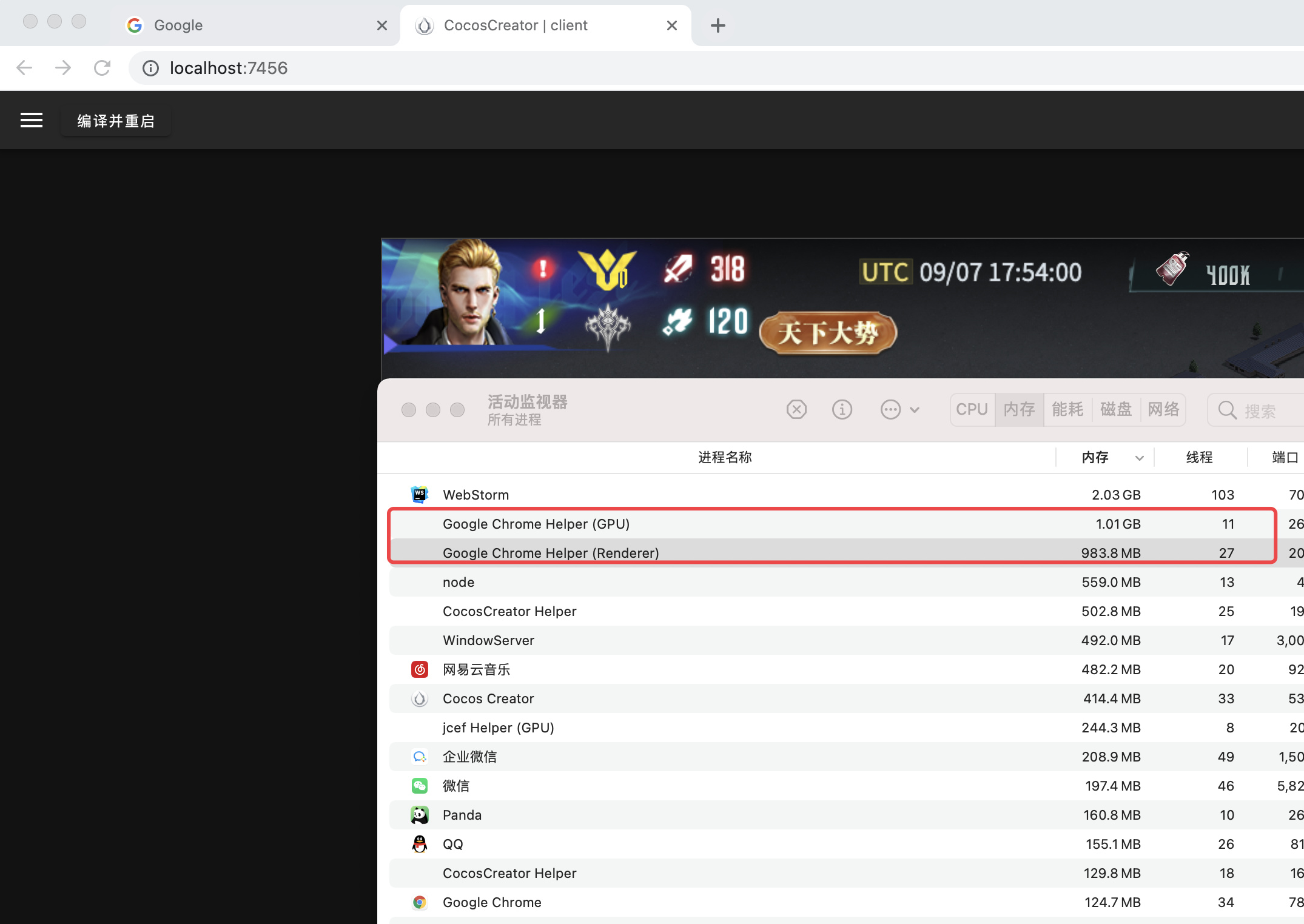 通过2.4.6运行游戏然后切换到webstorm编辑器,卡成一帧一帧的,然后关闭游戏再切换到编辑器,又 正常了。
