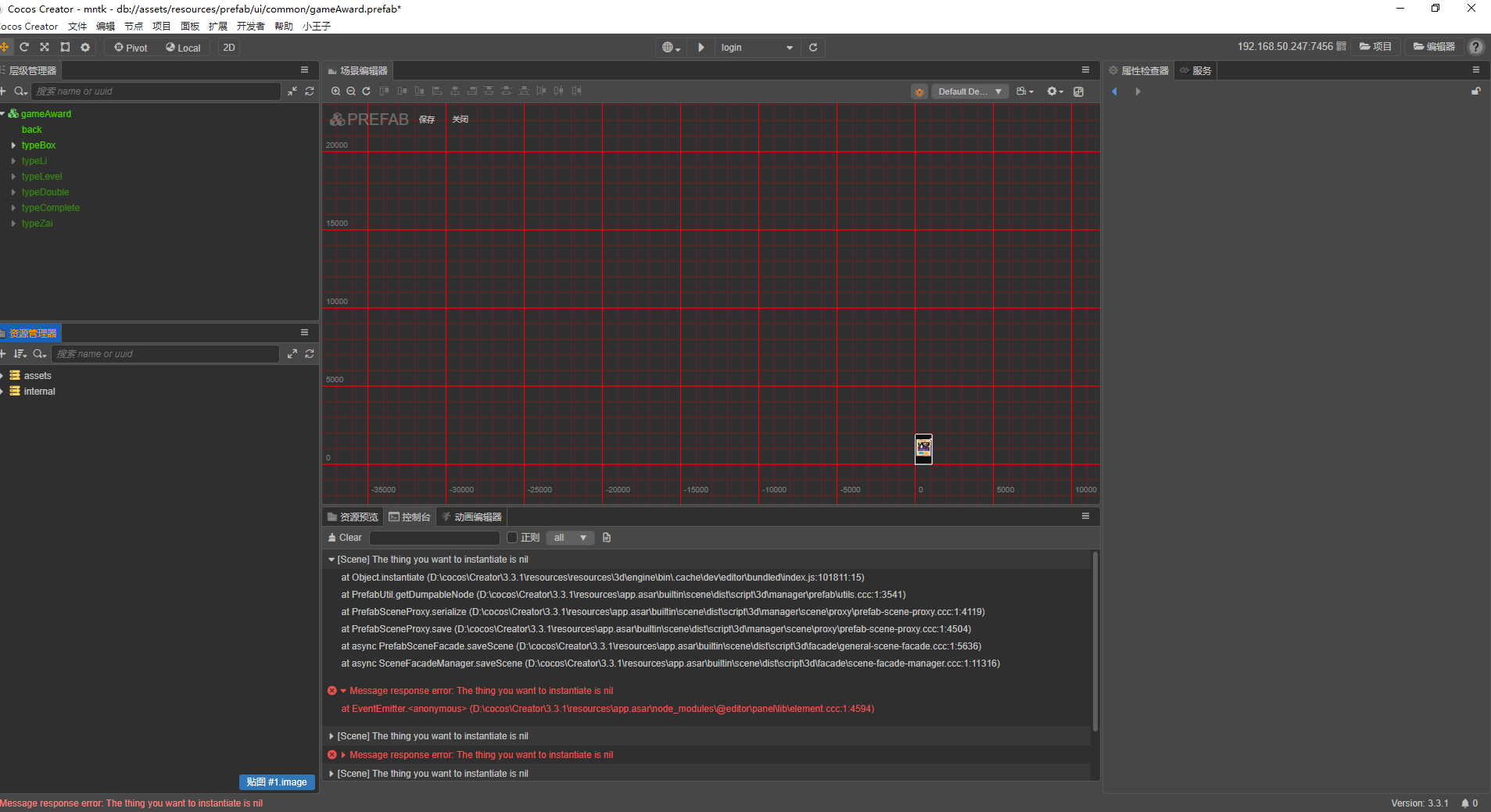 估计是某些组件里需要手动(拖动)添加绑定的节点或预制体没有绑定。某些组件里需要绑定的属性引用,但这些组件是代码里动态添加使用的,那么相应的须绑定属性引用就是默认的空值。比如node+component,component里有需要绑定的prefab,但使用时是在代码里new了一个node,然后add了这个component,那么这个component里引用的prafab就还是个空值,此时如果instantiate这个prefab就是触发一样的报错。The thing you want to instantiate is nil
