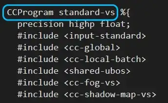 - 所有顶点着色器代码需要在“CCProgram standard-vs”标签下用 GLSL 编写,同时也可以使用 Cocos Creator 内置的 Shader 参数,具体的列表可以在「常用 shader 内置 Uniform」[2]获得;