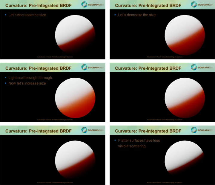 让我们来看一个实验:有一个呈现次表面散射的球体,被单一光源照射。光源的位置和强度不变,放大和缩小球体的大小,观察次表面散射颜色的变化。