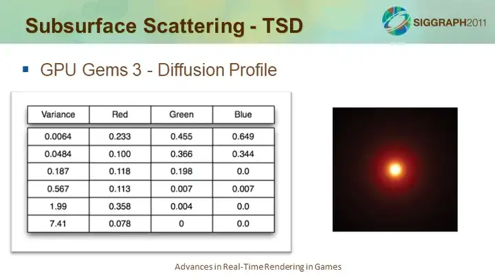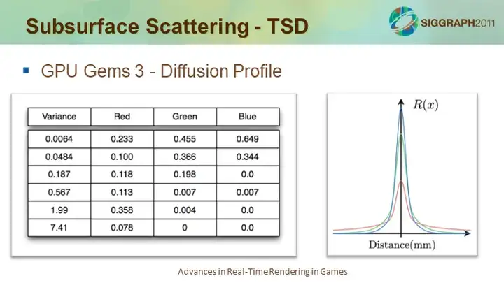 这张表看上去有点不明觉厉,简单地说: 我们所观察到的皮肤上的红色,其实是皮肤的不同截层以不同的颜色和强度曲线分别进行散射,再叠加而成。 这张表列举了六层不同的颜色和曲线。而所有截层的散射强度都以正态分布排列,所以我们可以在右图看到自然衰减的晕染。