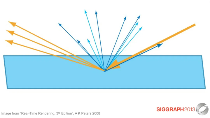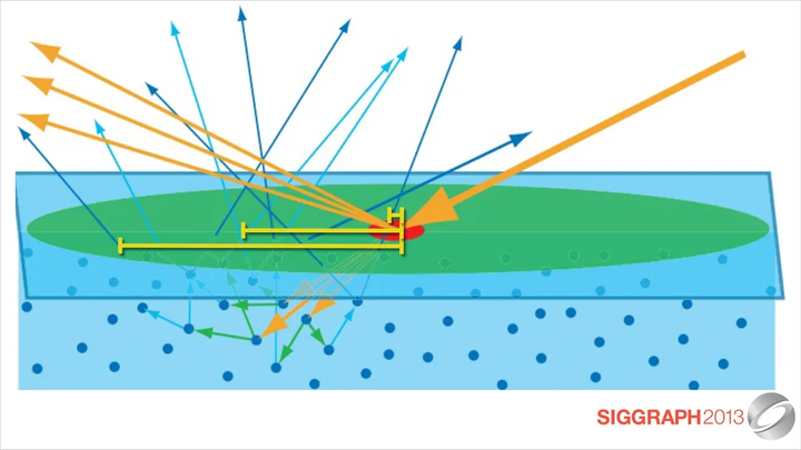 你大概已经注意到:当漫反射光线经过在介质 B 中的种种流程,重新射入介质 A 时,距离原来射入介质 B 的入射点已经有了一段距离。对于绝大多数材质来说,这个距离非常微小,完全可以忽略不记,所以我们可以理解为漫反射光线是由原入射点射出的。