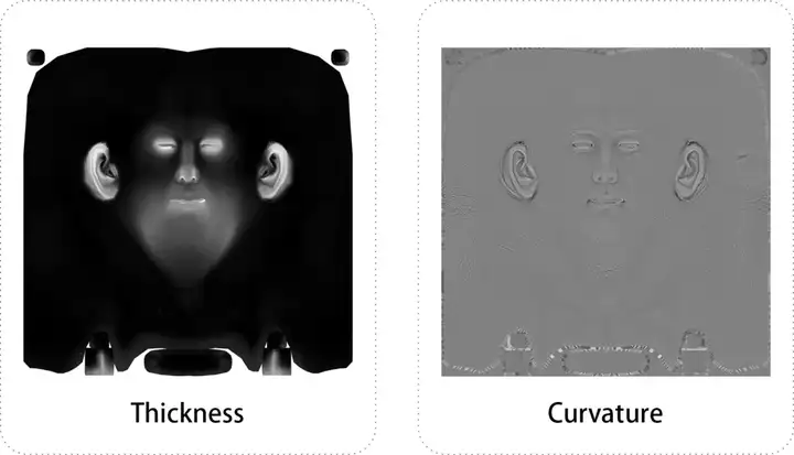 - 我们需要一张 Thickness 贴图和一张 Curvature 贴图,帮助我们识别物体那些部位容易出现次表面散射;