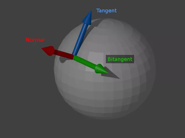 我们知道,物体的顶点存储了切线空间数据:以顶点法线方向为一轴,顶点切线(与顶点法线垂直,与表面平行)为另一轴,与顶点法线和切线都垂直的第三个向量为第三轴。其中顶点法线和顶点切线已经包含在网格的顶点数据当中了,模型的同学已经帮我们处理好了光滑组或软硬边(取决于美术同学用的是 3ds max 还是 Maya),并按照需求提供了法线贴图。第三个向量,通常被称为副切线向量(Bi-tangent 或 Bi-normal),我们可以根据它垂直于顶点法线和顶点切线的特性,用叉积计算得到它:
