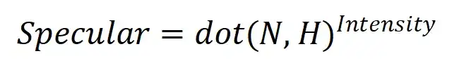 当然,我们不能机械地把 Specular 理解为强度极高、范围极小的 Diffuse。高光除了受到光照方向的影响之外,还与我们观察的角度相关。因此我们引入一个光照方向(L)和观察方向(V)之和的半向量 H,套用“N·L”的方法用它与法线 N 求点积。高光的强度远高于 Diffuse 的强度,所以我们把强度参数作为点积的指数输出。由此,我们就得到了一个基本的计算 Specular 的公式: