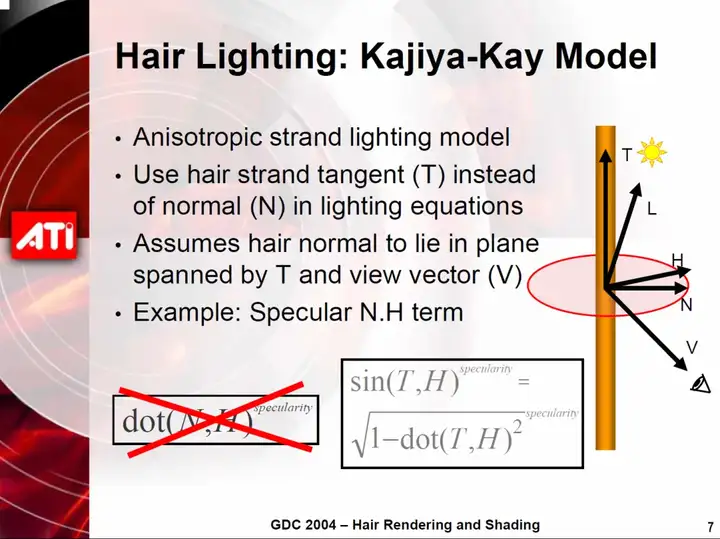 目前我们在游戏中看到的大多数头发各向异性渲染效果,都基于早在1989年发表的 Kajiya-Kay 模型 。那么,什么是 Kajiya-Kay 模型?