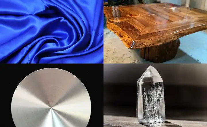 除了头发之外,任何物理上由无数会产生高光的细丝密集组合成的材质,都会表现各向异性的高光特性,比如丝绸、大多数的晶体、抛光的木材、拉丝抛光处理的金属等。