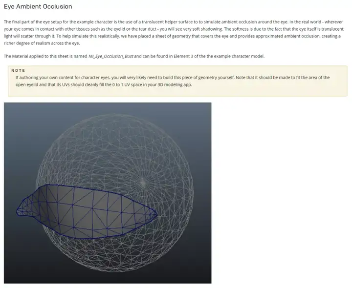 如果是一个静态的部位,这个问题非常好解决:烘培一张 AO 即可。但是对于角色来说,绝大多数的角色眼球是需要骨骼动画的,直接把 AO 烘培在眼球上显然不可取。我们需要做的是在眼球的模型前方再新建一个遮蔽的模型,给它赋予一个 AO 的透明贴图,单独作为 AO 保留在模型上。这个模型除了 AO 将不会起任何其他作用,因此只需要给予一个基本的 Unlit 材质,也不会消耗额外资源。这种做法,也是包括 UE4 在内的许多引擎选择的做法。