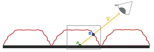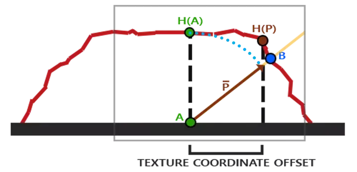 如上图所示,灰色平面代表物体的基本网格平面,在此基础上物体有突起的表面结构,用红色曲线表示。当我们以上图 V 向量的方向观察物体时,我们理应观察到红色曲线上的 B 点,当突起的表面结构不存在时,我们则会观察到基本网格上的 A 点。换言之:我们需要 A 点上的网格数据,去实现高度在 B 点的渲染效果。