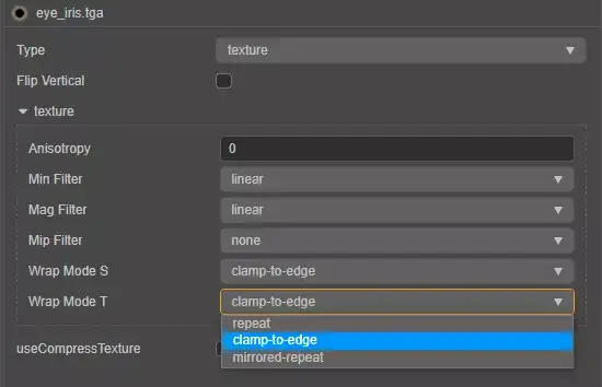 当然,我们的眼珠只需要一个虹膜。我们既希望利用常量相乘的办法缩放 UV,又不需要贴图的叠加,只需要在贴图的属性中将 Wrap Mode 设为 clamp-to-edge 即可。