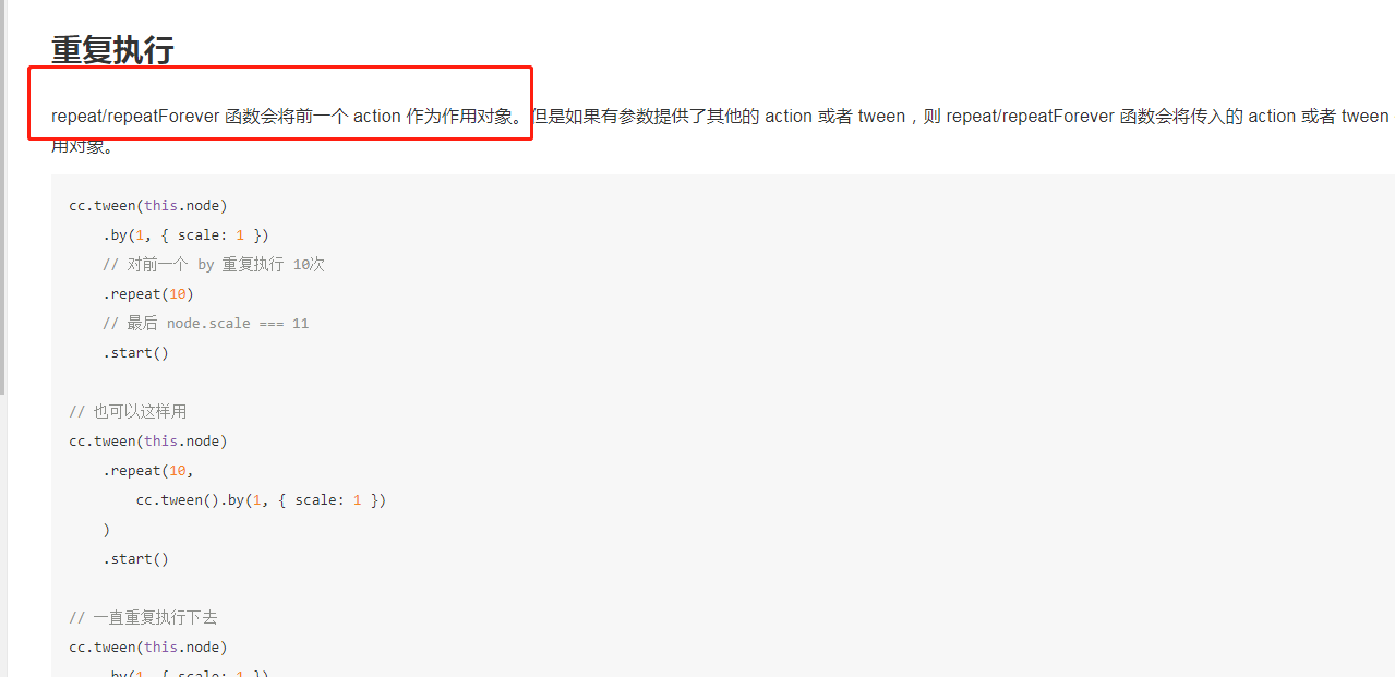 cc.tween(…).to(…).to(…).union().repeatForever().start()