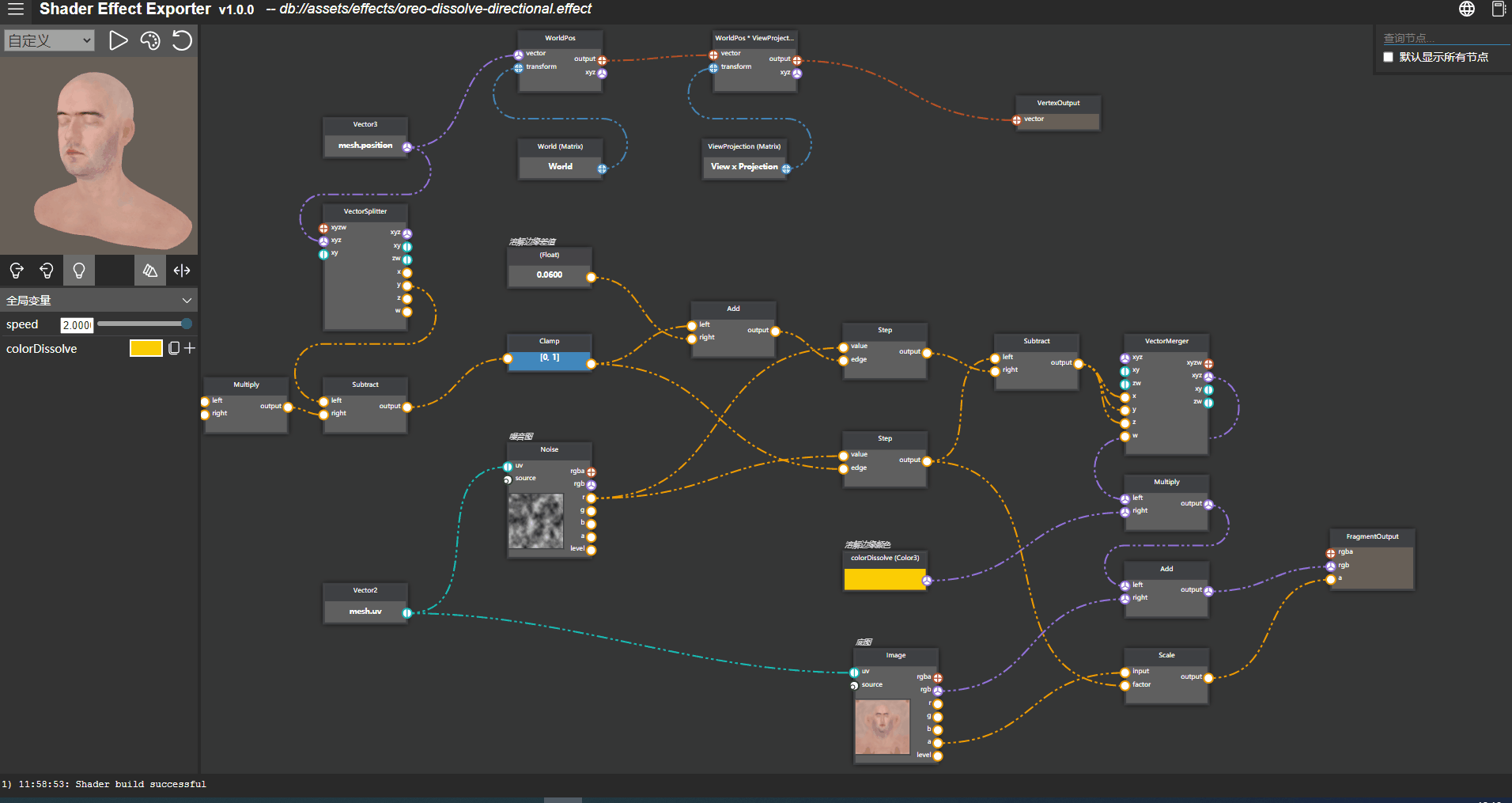 VertexOutput根据节点树计算出一个Vector4裁剪空间坐标作为顶点着色器的结果输出,最终生成 effect 内顶点着色器部分的代码如下: