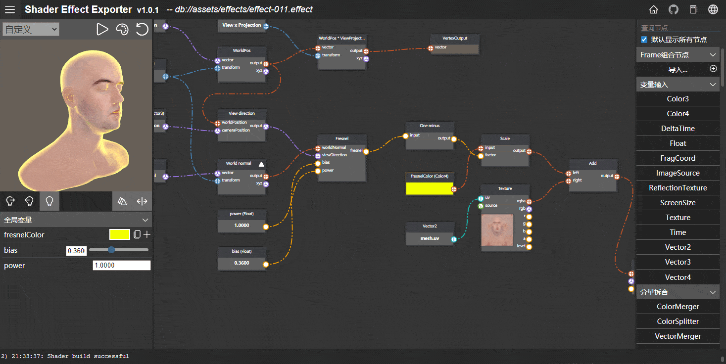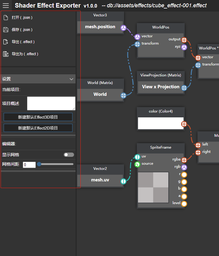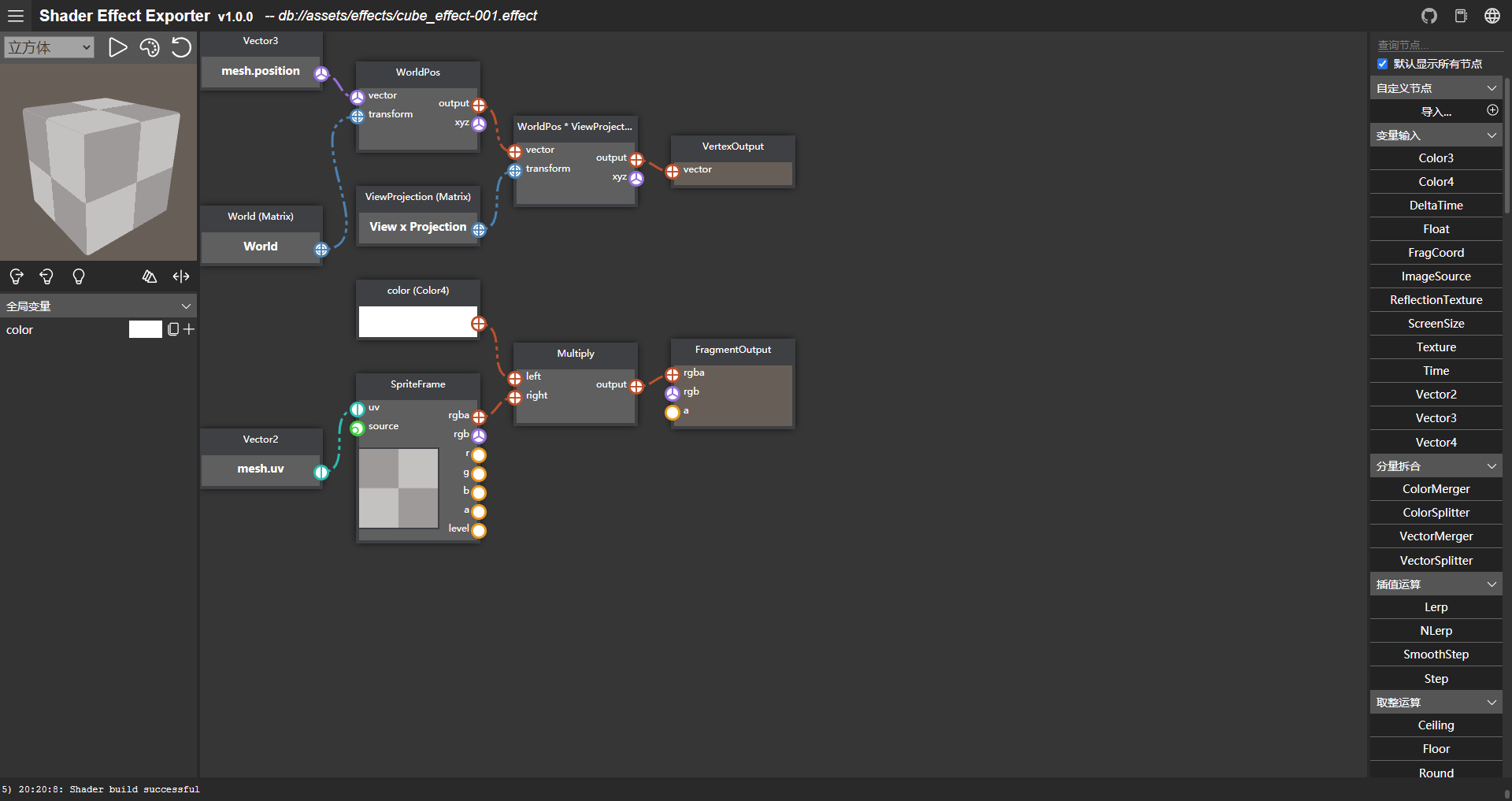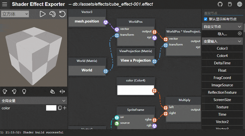 Cube节点,新建effect、material文件,为material指定effect后,右键选中刚才新建的material或effect,可看到编辑 Effect相关菜单,点击即可打开Effect Exporter编辑器。简单修改下默认模板(这里只是简单调整了颜色),点击左上角菜单导出(.effect)即可导出到关联的effect文件并实时生效预览:注: