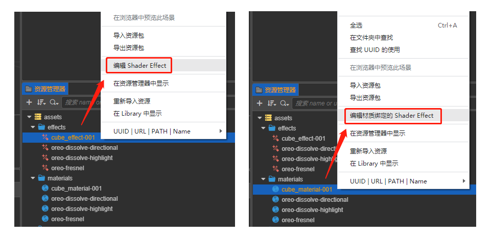 资源管理器面板选中任一effect或material文件,如果右键菜单出现编辑 Effect等字样,则表示插件已导入成功: