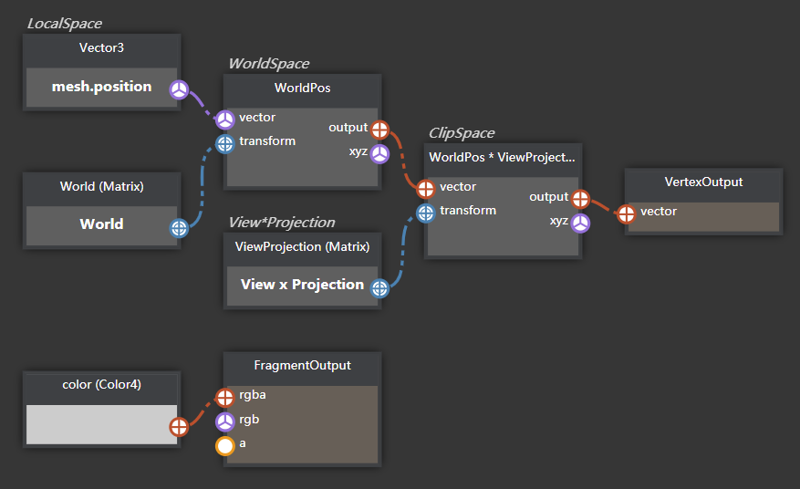 vec4 vert(void) { //WorldPos vec4 output1 = cc_matWorld * vec4(a_position, 1.0); //WorldPos * ViewProjectionTransform vec4 output0 = cc_matViewProj * output1; //VertexOutput vec4 target_VertPosition = output0; return target_VertPosition; }以上需要了解