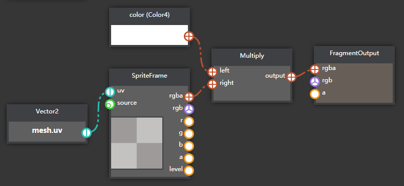 MultiplyBlock乘法节点,用来混合贴图颜色与 Color4 定义的颜色,生成的effect代码如下:vec4 frag(void) { //SpriteFrame 纹理采样 #if (USE_2D_SPRITE_FRAME) // 当启用宏 USE_2D_SPRITE_FRAME 时,采样 cc.Sprite 自身组件上的纹理 vec4 tempTextureRead = texture(cc_spriteTexture, transformedUV); #else // 采样 SpriteFrameSampler 定义的输入纹理 vec4 tempTextureRead = texture(SpriteFrameSampler, transformedUV); #endif //纹理权重 vec4 rgba = tempTextureRead.rgba * SpriteFrameWeight; //Multiply(乘法结节,这里用来混合颜色) vec4 output2 = u_color * rgba; //FragmentOutput(最终输出的颜色) vec4 target_FragColor = output2; return target_FragColor; }在CocosCreator中演示效果如下:
