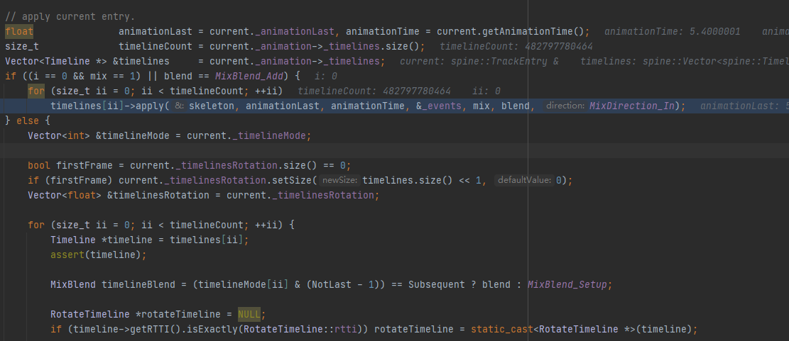 重现方式:动态加载SkeletonData,播放完成后release掉资源,重复如此几次后就报错了。Web平台正常,Android平台异常。附上一张报错前的调试图,timelineCount已经是四千多亿了