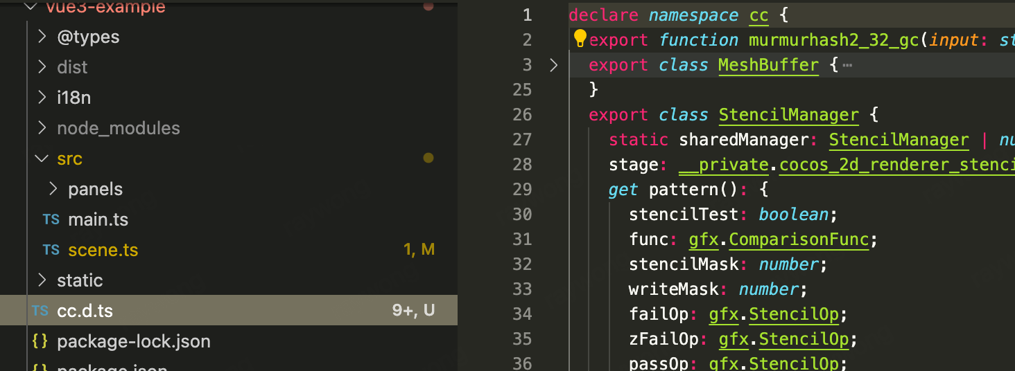 你要手动修改cc.d.ts的第一行为namespace cc,这也是我以前吐槽过cocos的,插件系统和运行时用的两套dts