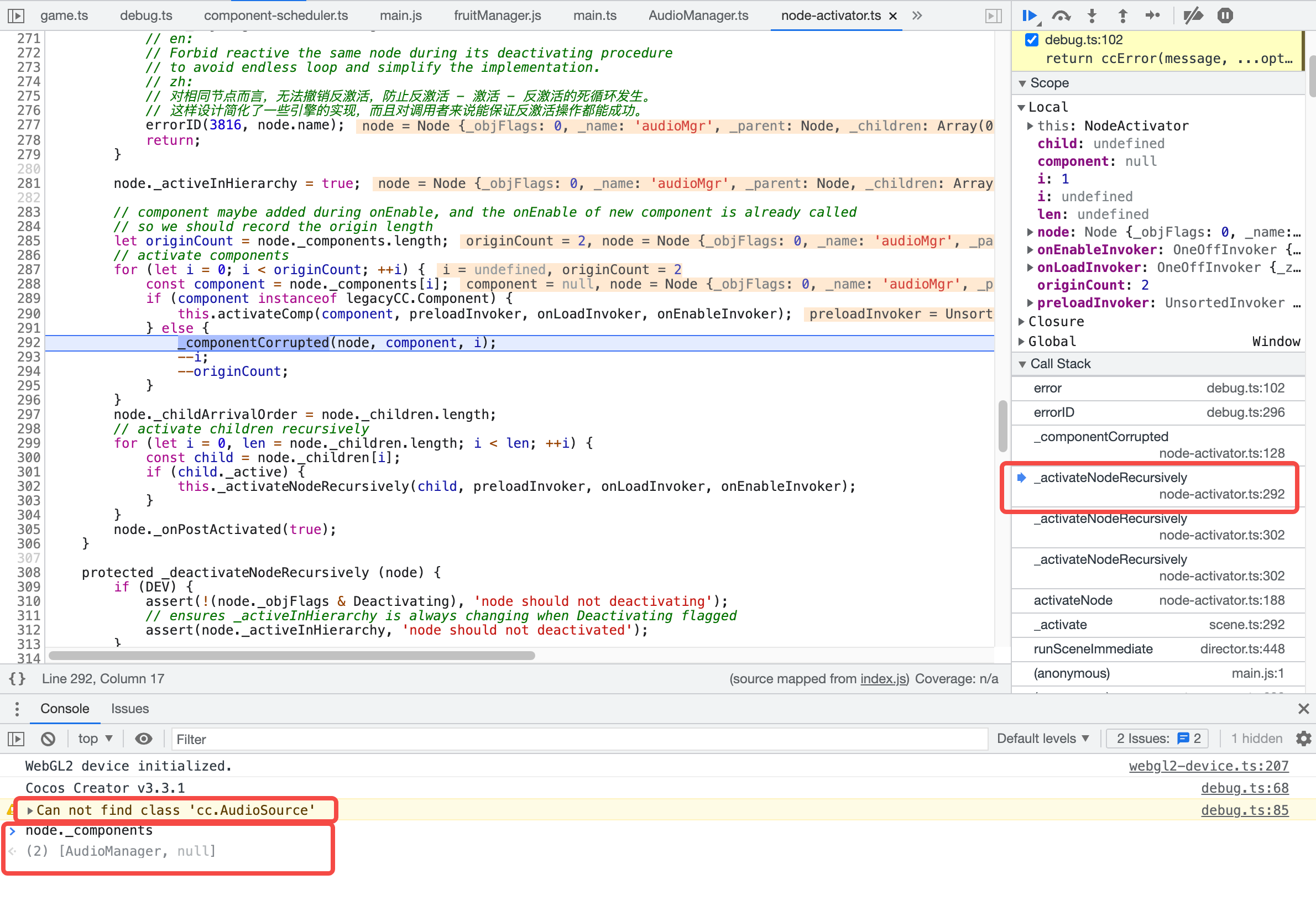 audioMgr这个Node添加了AudioSource和一个脚本,为啥onLoad阶段提示找不到AudioSource这个类,component只显示出了脚本组件,这是啥bug吗