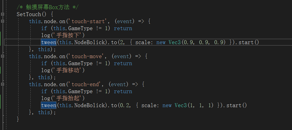 因为缩小动作时间长,你要想抬起后把按钮放大,应该在end函数里面停止缩小动画再播放放大动画,2.x的api是node.stopAllactions,你要去查查3.0的api,感觉你对tween的使用不是很清楚,应该去看看官网的tween文档,了解一下官方给的例子或者项目中的官方案例