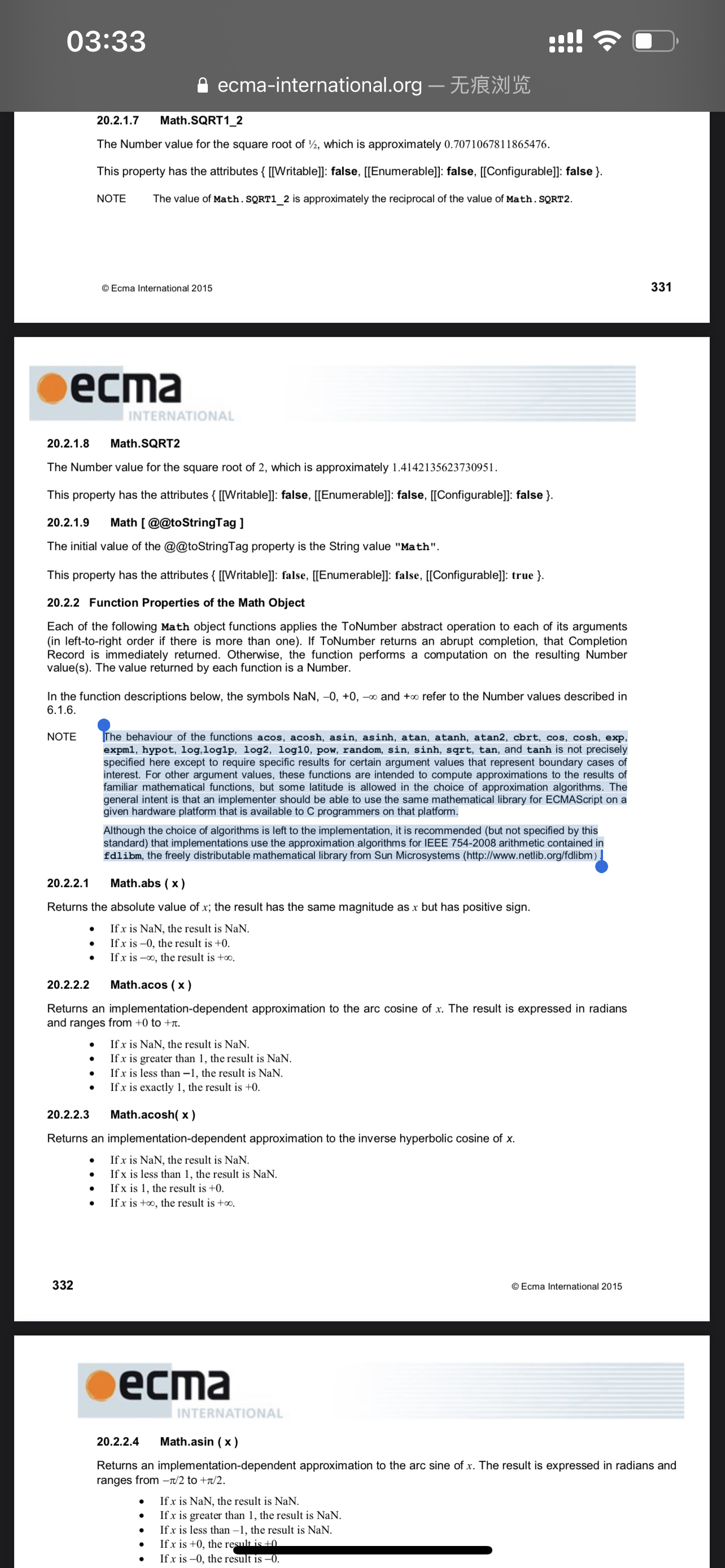 我当时测试时候用的是一台安卓魅族(好像是联发科的U),另一台是苹果,而且我发现并不是所有运算都有差异,当时测了好久,也只测出一两个实例(当然我没发现的肯定有)。