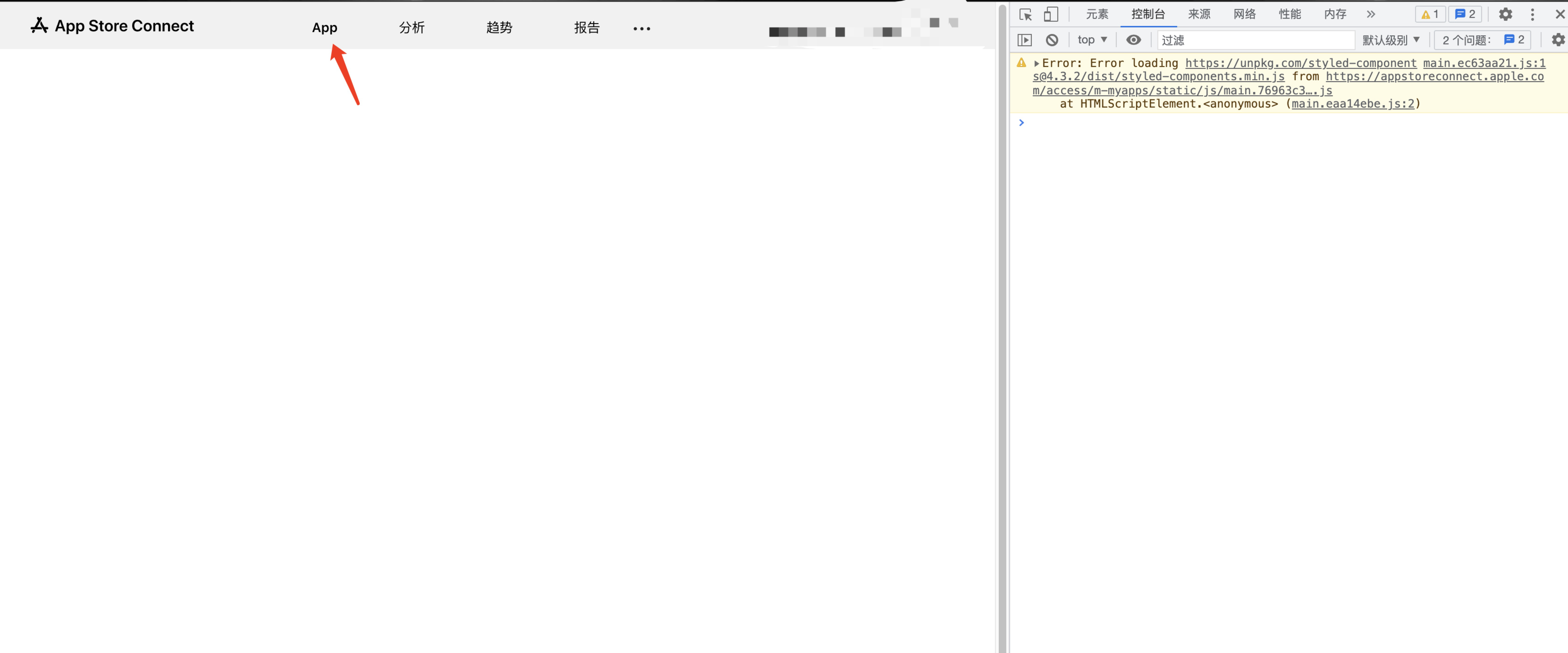 (在线等)app store connect 登录进去 选择app页签报错 其他页签可以正常显示内容