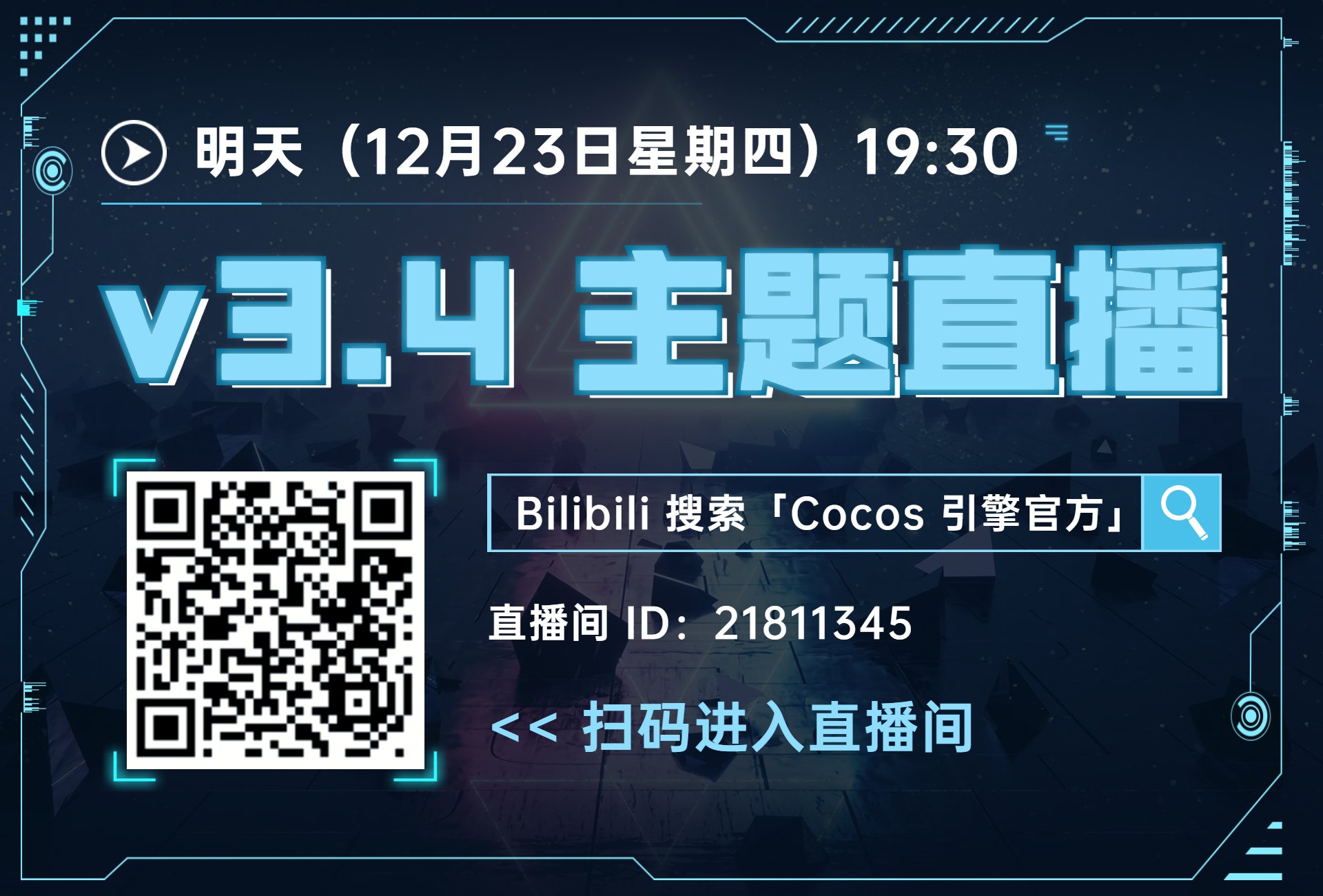 明天(12月23日星期四)晚上19:30,引擎产品总监 Jare、引擎研发工程师李的序、布道师放空、「Star Writer」Nowpaper 将在 Cocos B站直播间带来 v3.4 主题直播!