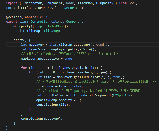 在Demo Controller.ts中,试验了通过设置active和opacity隐藏TiledTile节点,均没有变化。