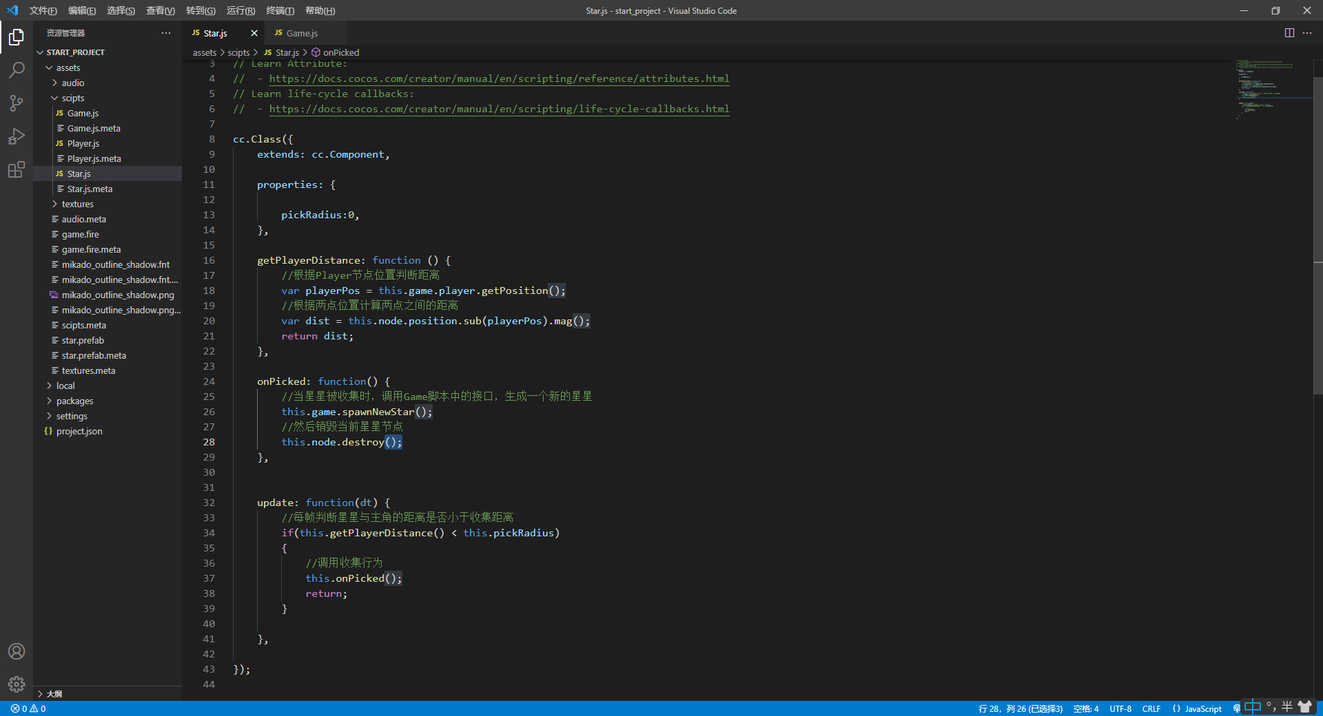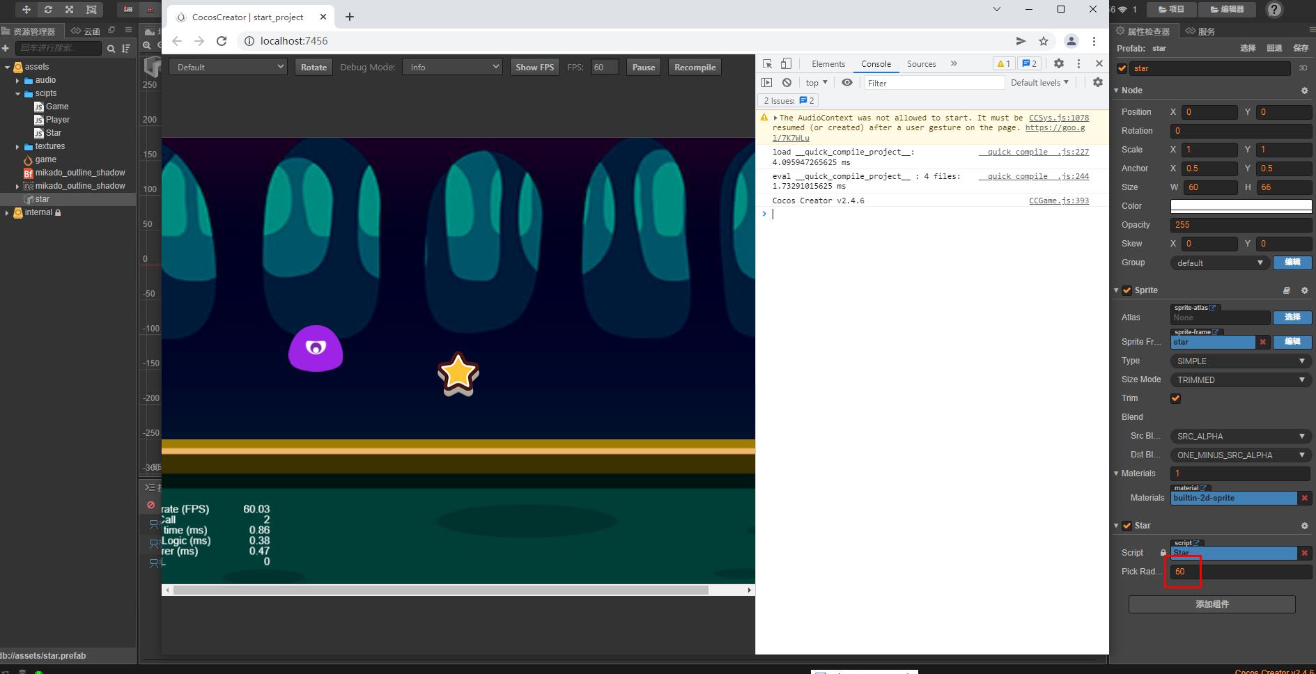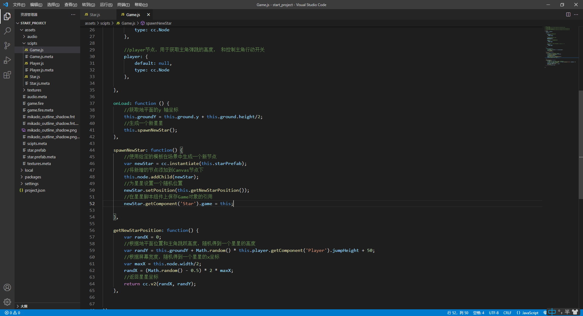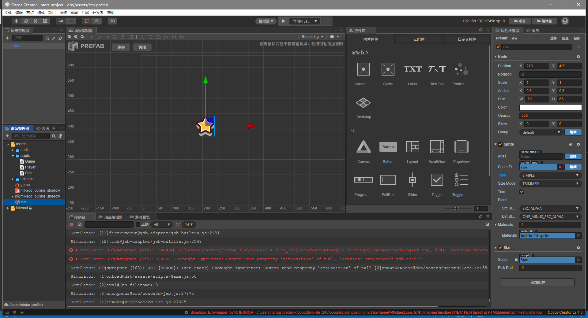 我是按照官方教程做的,预制里应该有挂载Star脚本的,但是不知道哪里出现问题。。项目上传到百度网盘了,麻烦大佬帮忙找找了