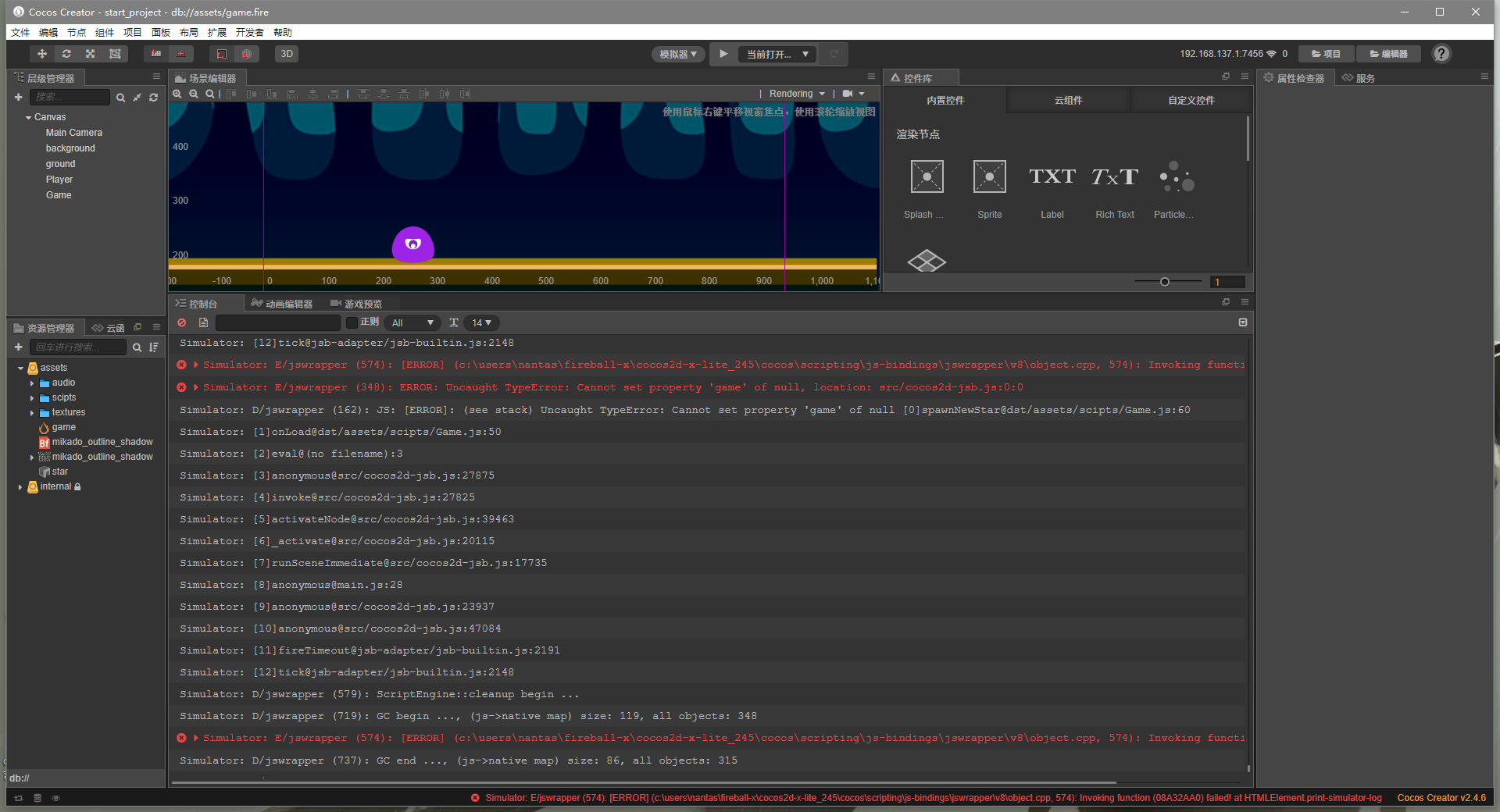 报错的位置是Game脚本,game为空,脚本中newStar.getComponent(‘Star’).game = this;处有game;