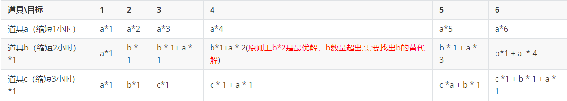 当目标为缩短1小时的时候的最有解,结果为使用 1个道具a。同理,目标为2时使用一个b,目标为3时使用一个道具3。观察3中的第二列解