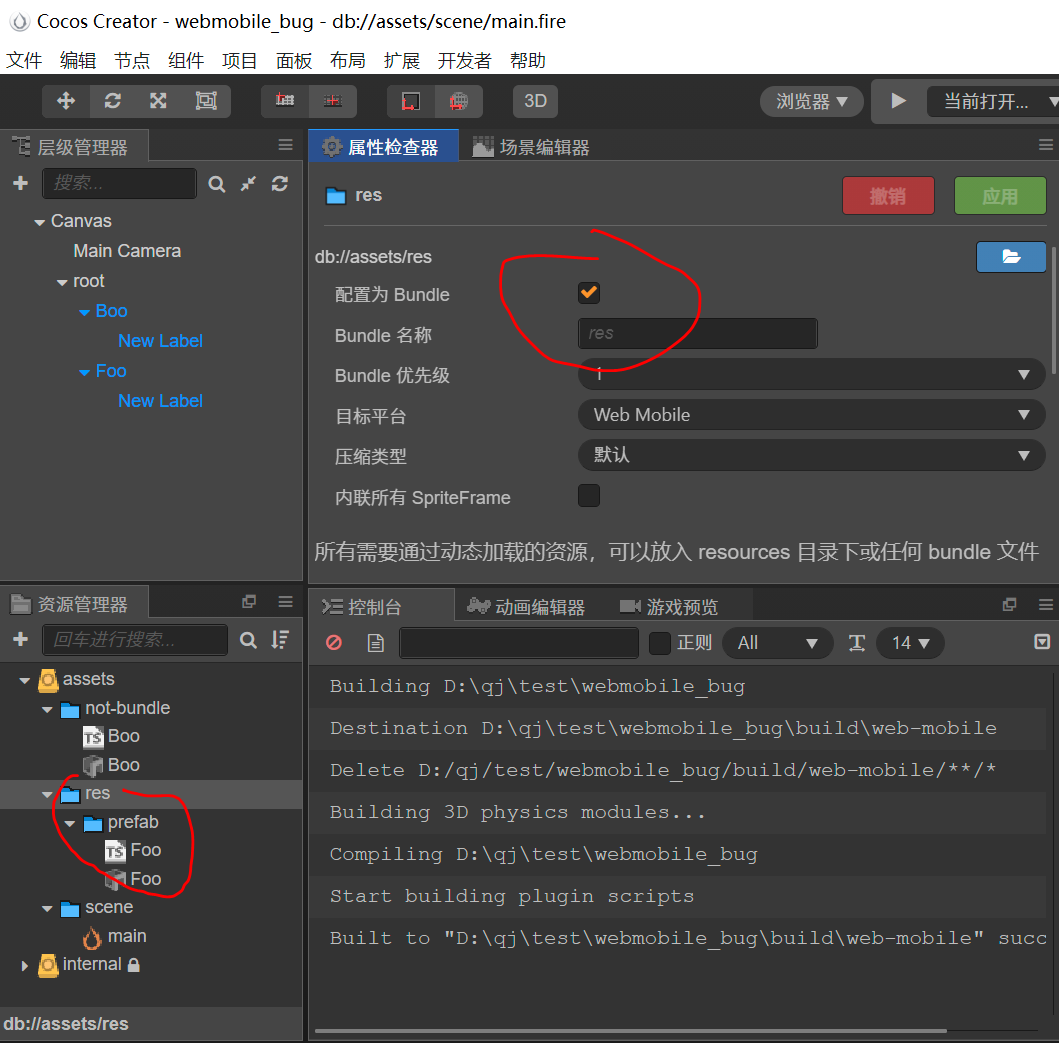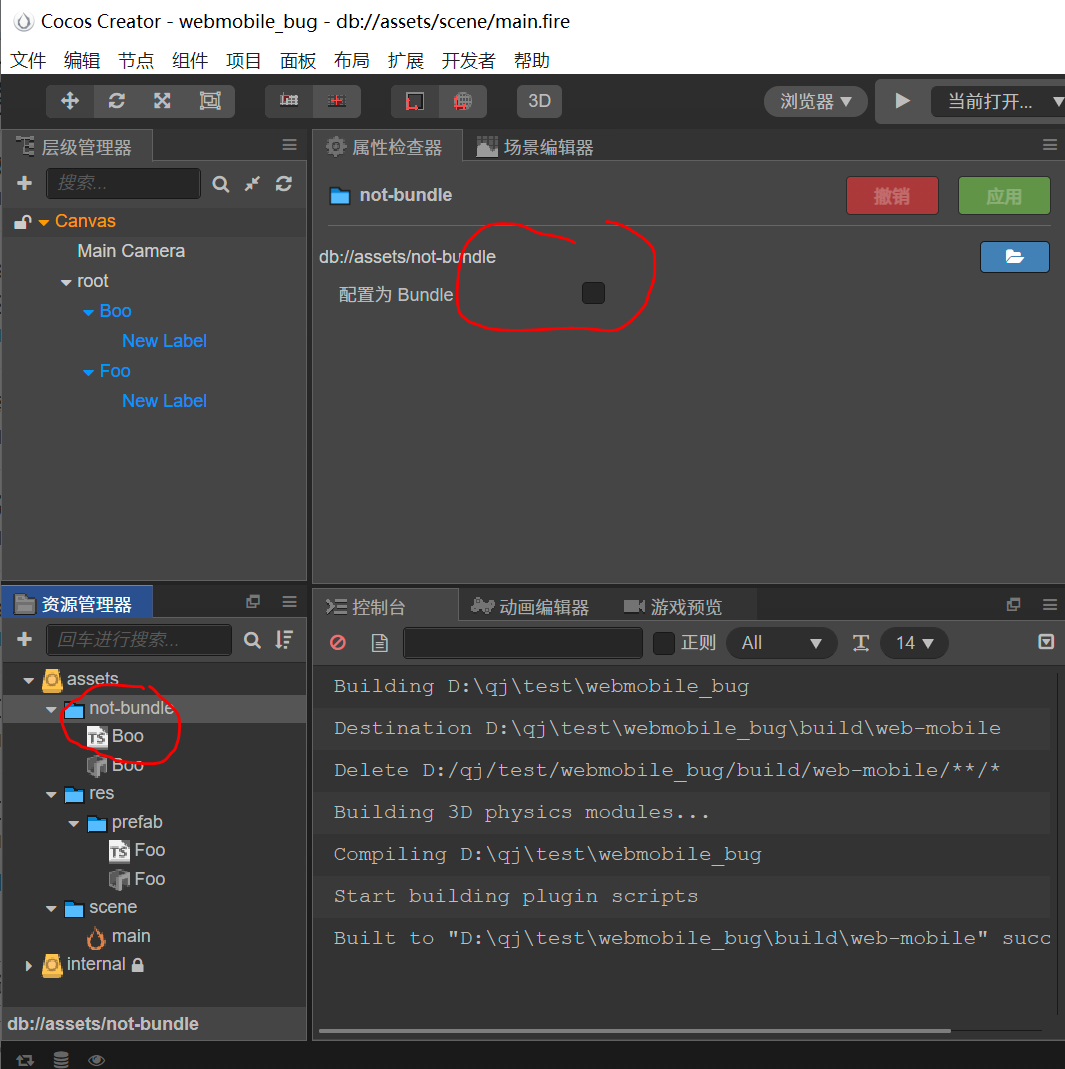 - 不勾选bundle的文件夹中的 prefab 运行正常。