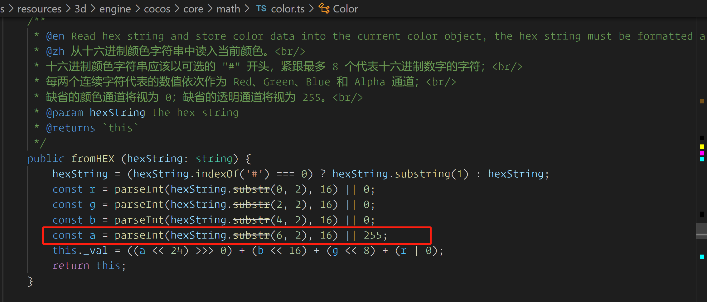 引擎里这行的写法,如果传入值的alpha为0,也会强行被设置为255,与预期结果不一致。 如#FFFFFF00,我想设置个透明色。