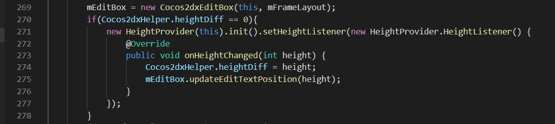 1,在Cocos2dxHelper中增加一个变量heightDiff用来保存获取到的软键盘高度。