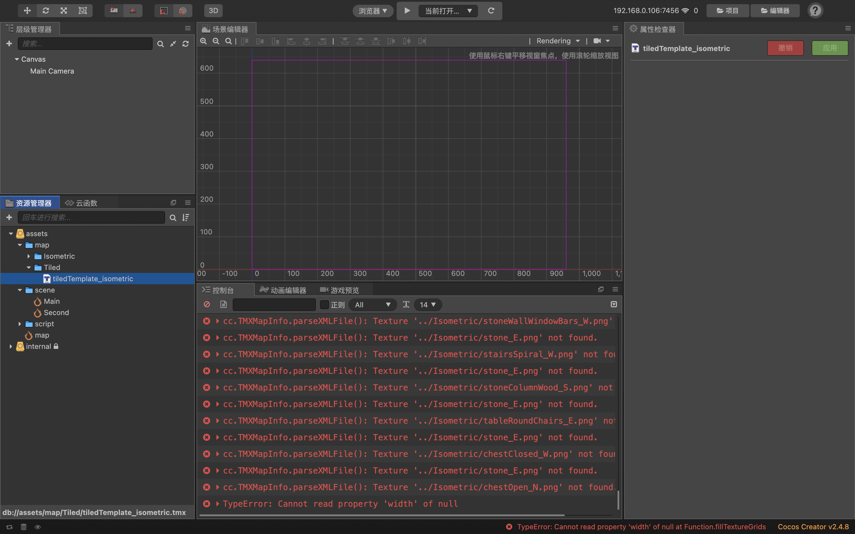 将地图资源挪至Canvas节点下失败,并且报错:cc.TMXMapInfo.parseXMLFile(): Texture ‘…/Isometric/stoneWallWindowBars_W.png’ not found.