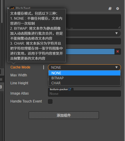 但是使用富文本 drawcall 会很高, 于是我采用这个图里的优化方案, 如果我选2。BITMAP,富文本刚开始是正常显示,但是我的文本有做滚动优化, 也就是说我的文本内容会经常改, 如果我的文本内容一直更改, drawcall 会变得和 选 1。NONE 没区别了。