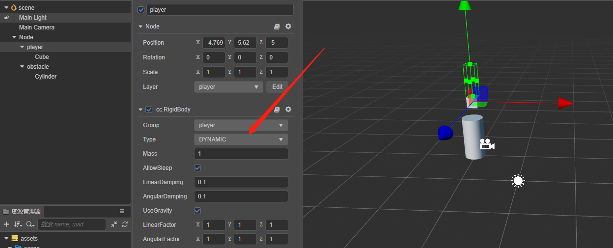 我这边创建了两个碰撞体,一个是玩家添加了BoxCollider,设置成触发器,一个是圆柱体添加了CylinderCollider。